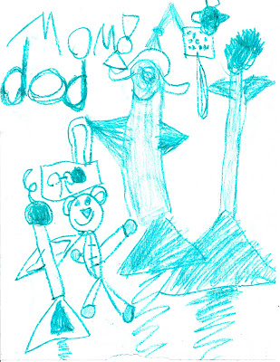 | Mommy airplane with purse and hair-do, daddy airplane with fly swatter (see the fly?) and baby airplane who has a teddy. |